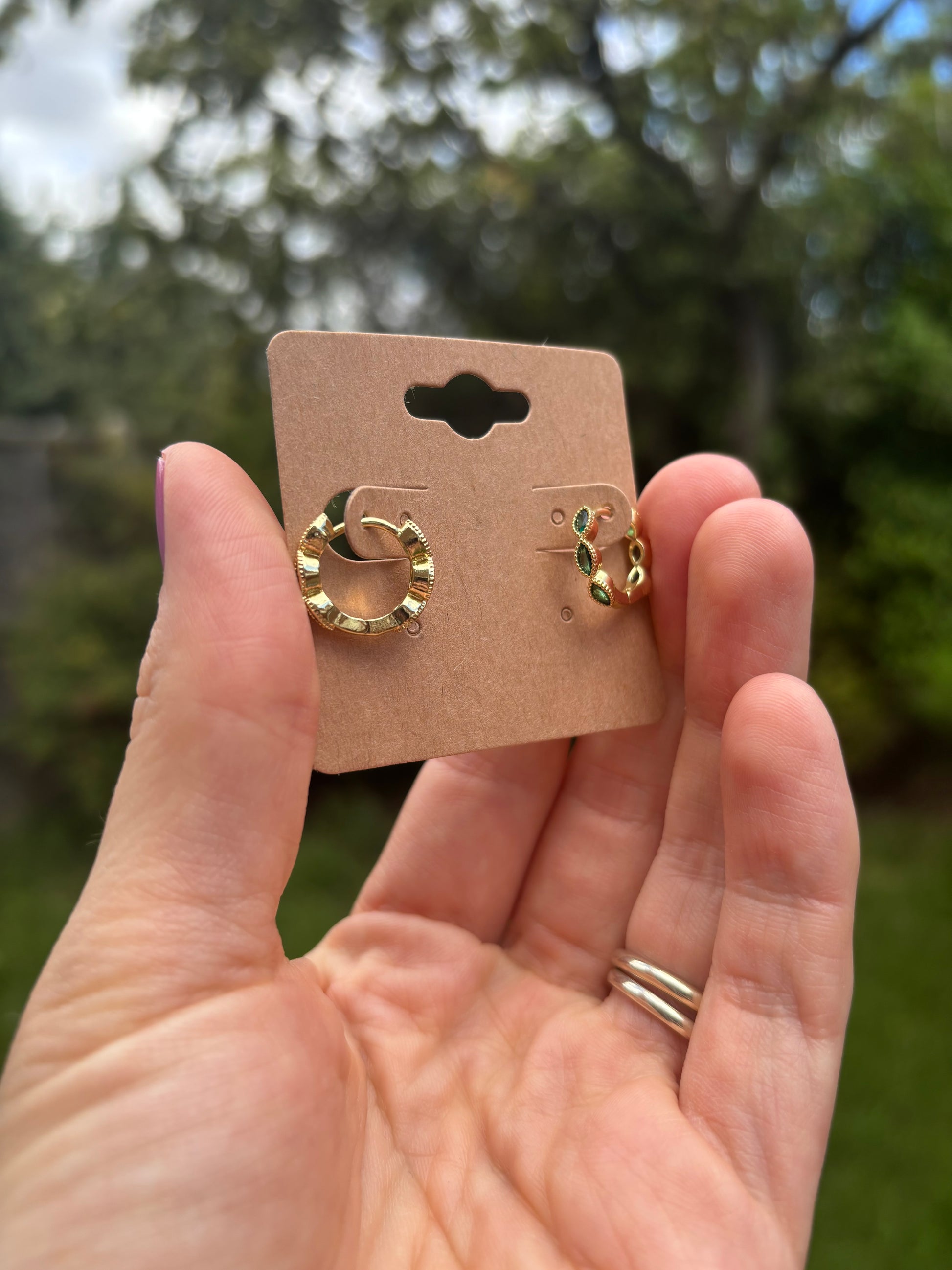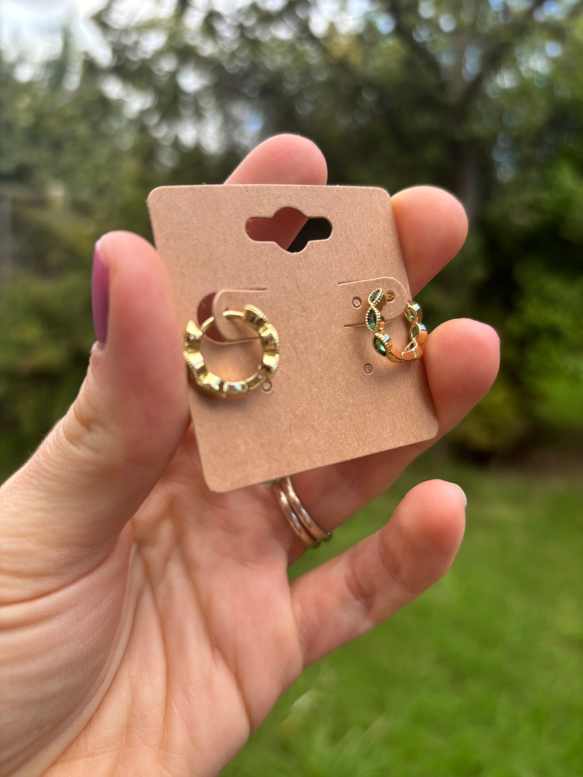 18k gold plated brass micro Huggies with green cubic zirconia.