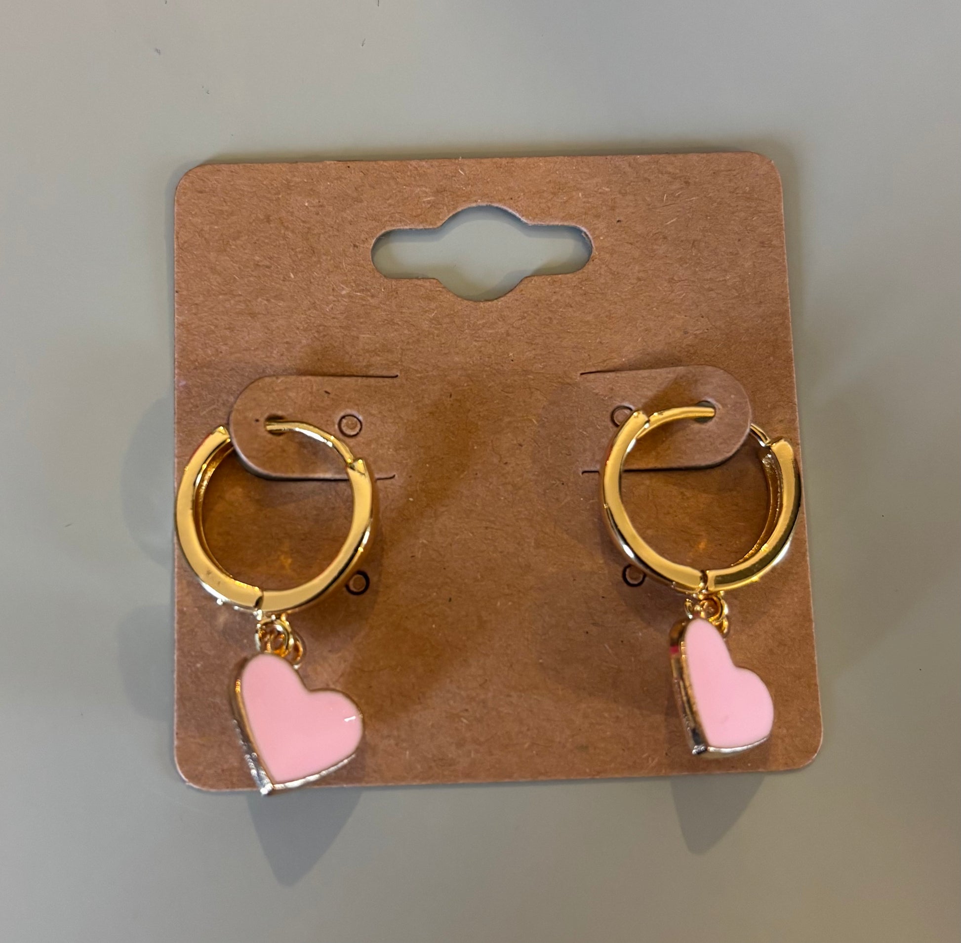 18k gold plated brass huggie earrings with pink heart pendants - nickel free