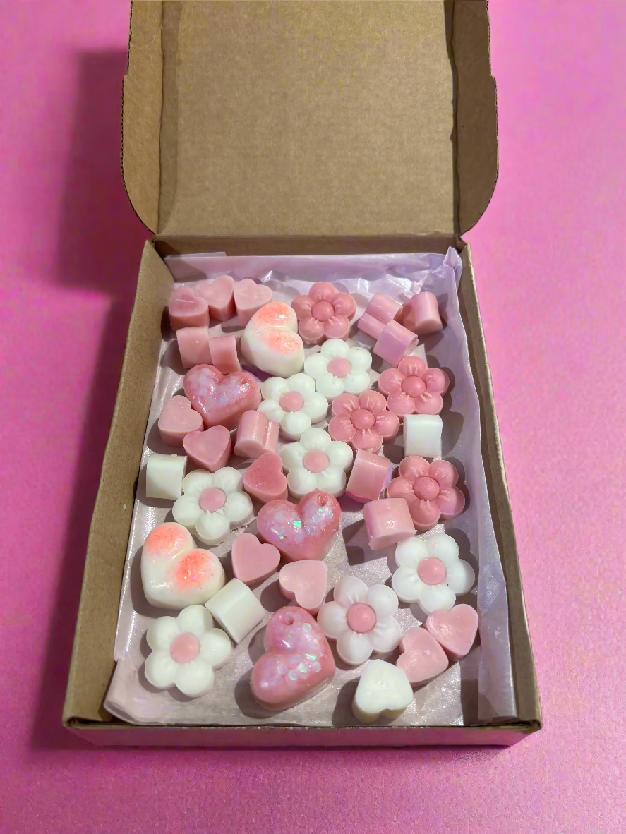 Mixture of pink & white wax melts in snow angel fragrance.